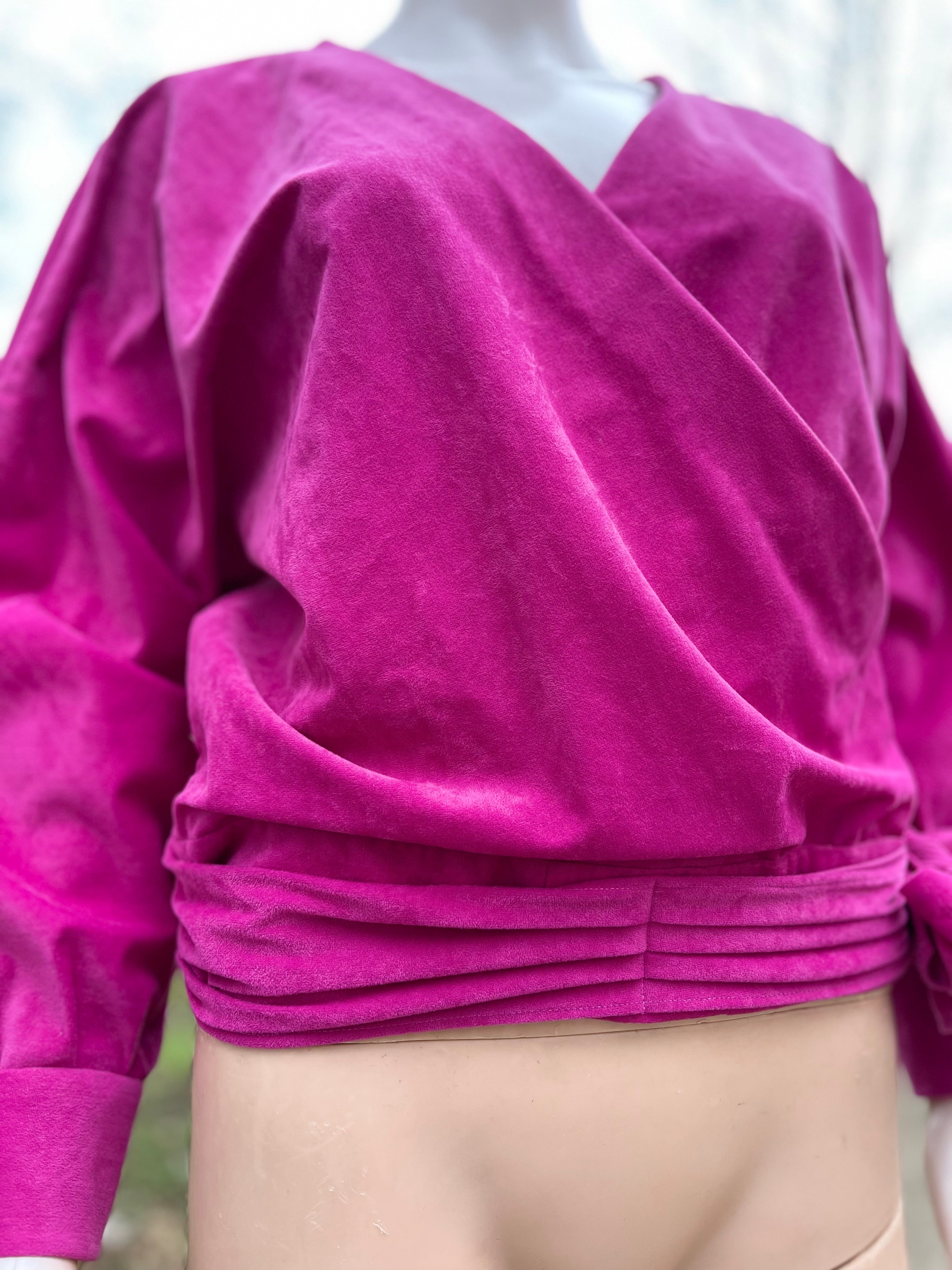 Superbe blouse vintage des années 80, faite main, dans un magnifique velours lisse fuchsia très vibrant.