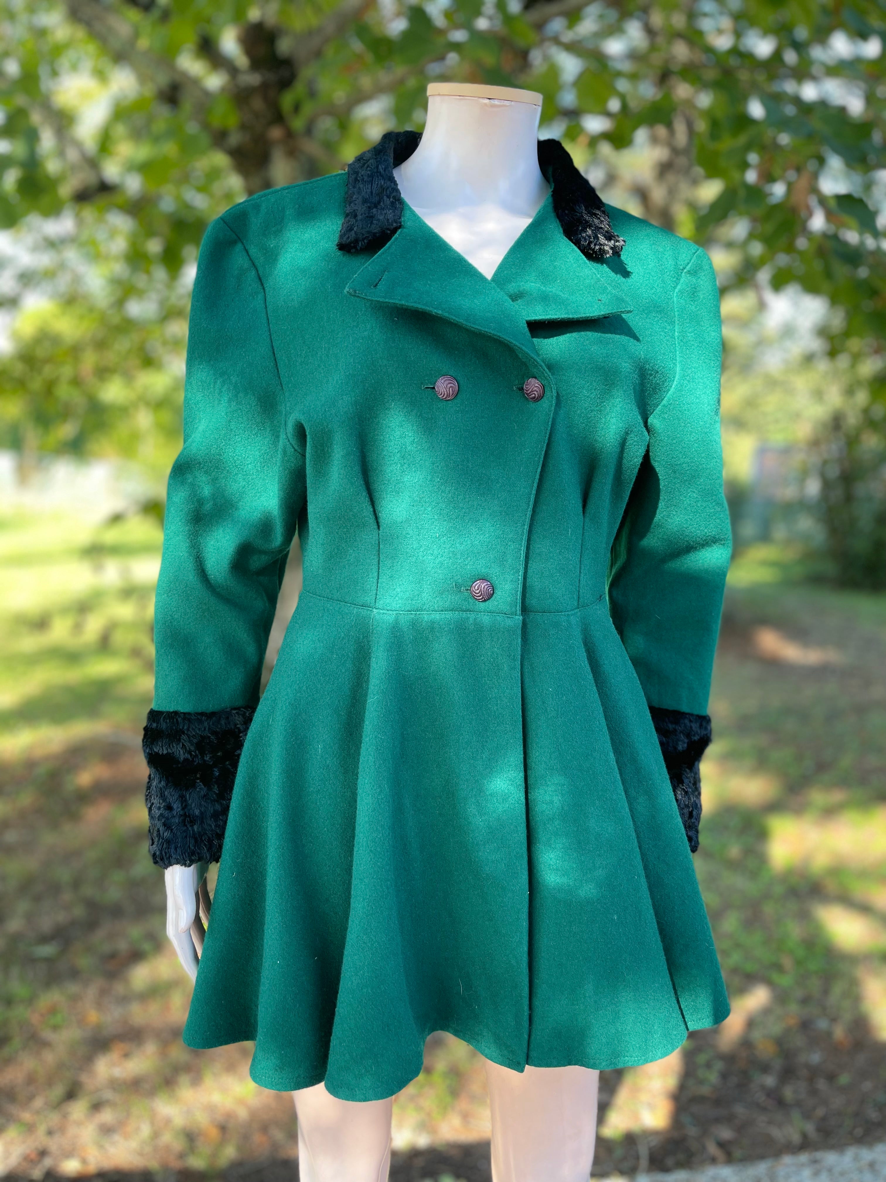 Superbe manteau vintage à la coupe patineuse, d’un vert intense rehaussé de détails noirs en fausse fourrure sur le col et les poignets.