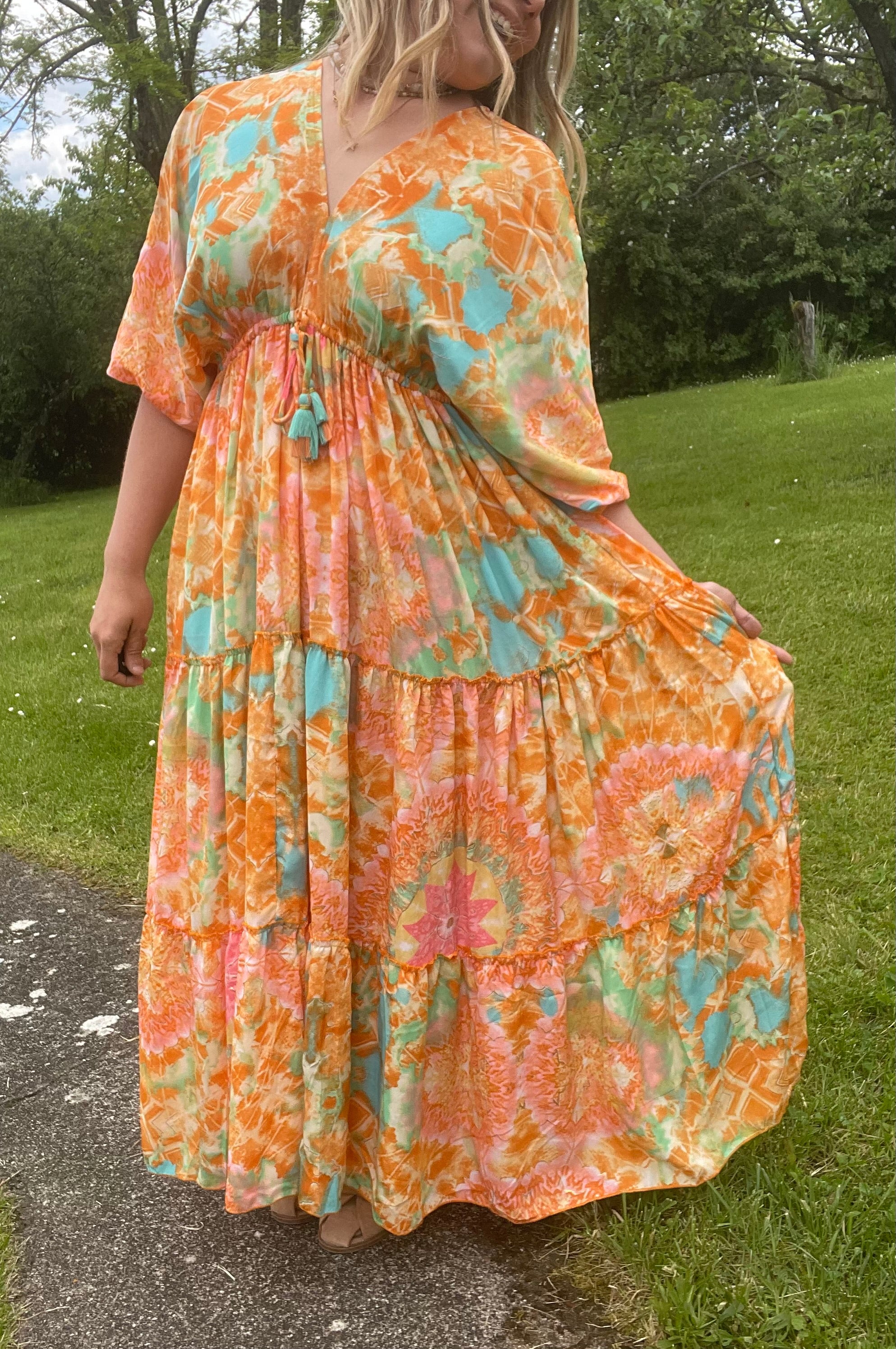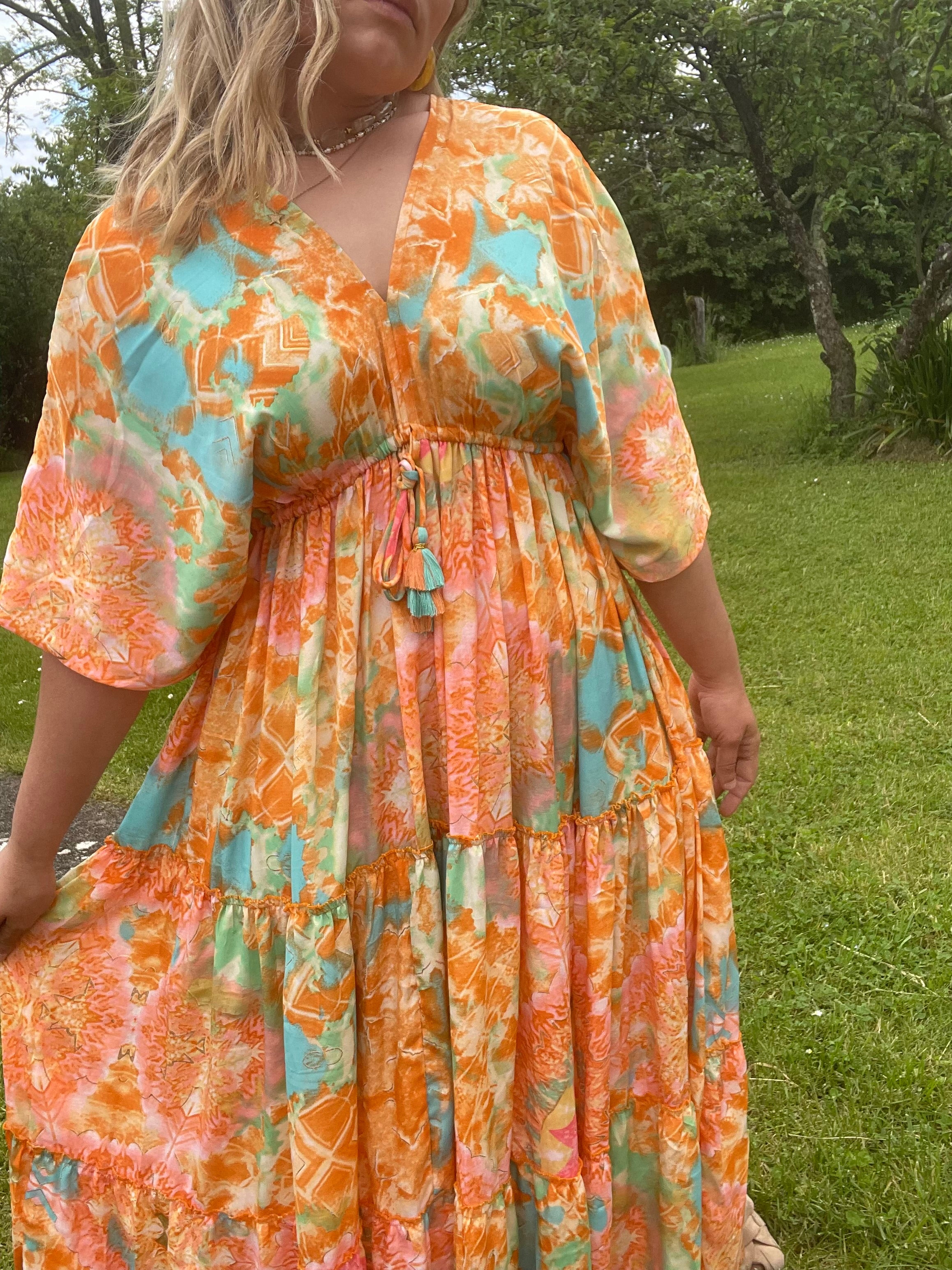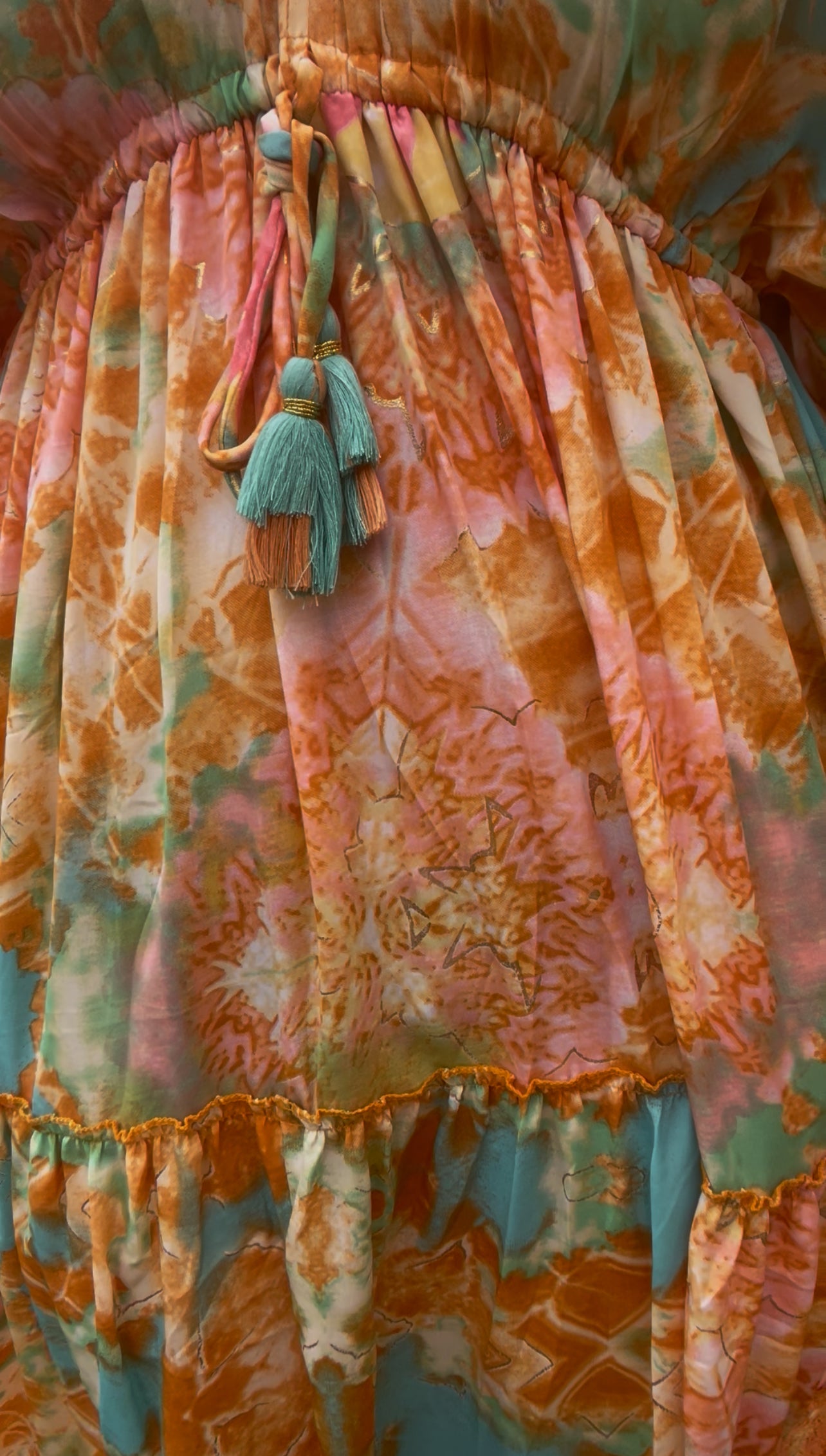 Son motif tie & dye mêle des nuances chaudes d’orange safrané, des éclats turquoise rafraîchissants et des soupirs rosés comme un jardin en fleurs. Une invitation au voyage, à l’audace douce, à l’été qui n’en finit jamais.