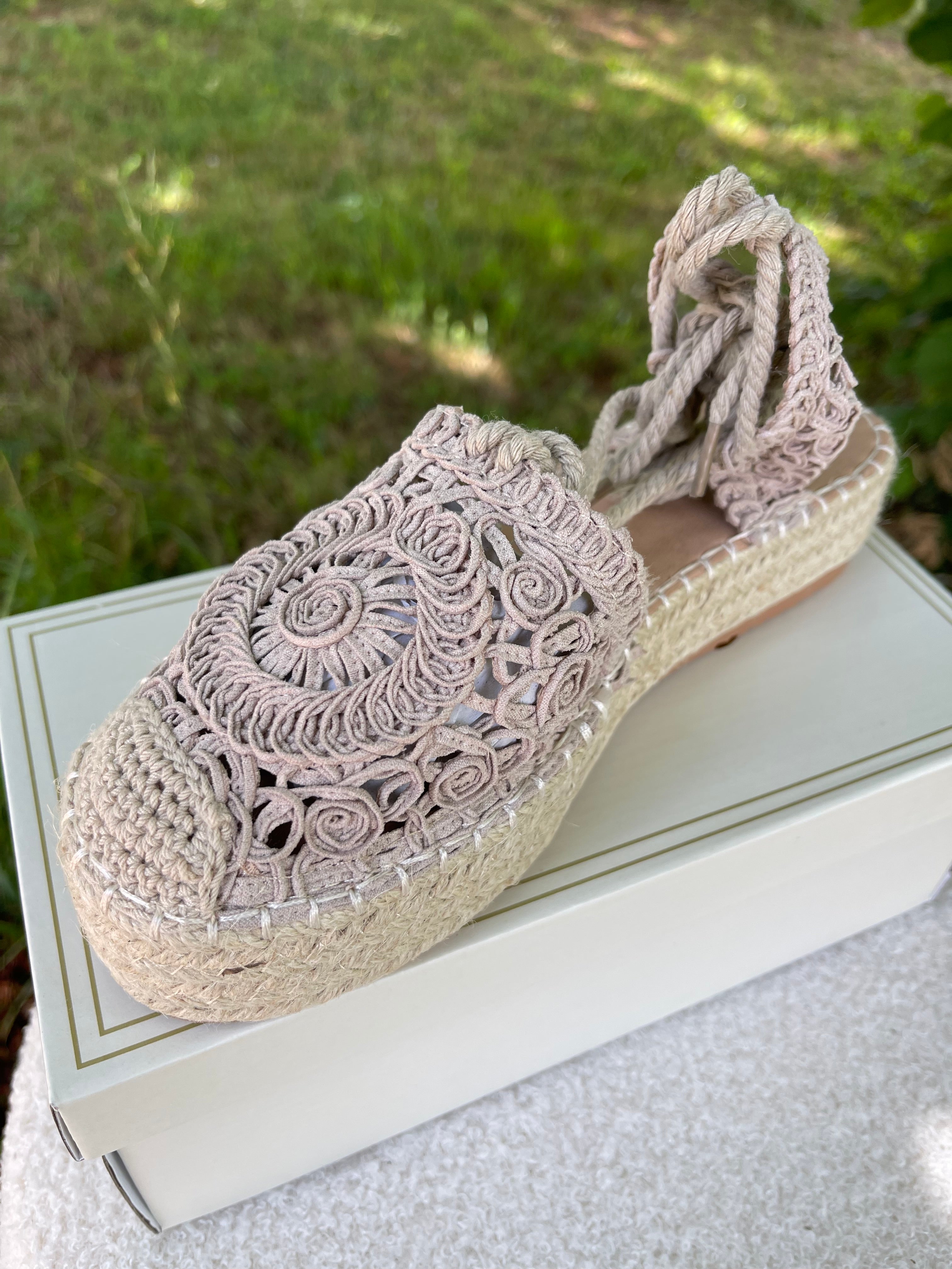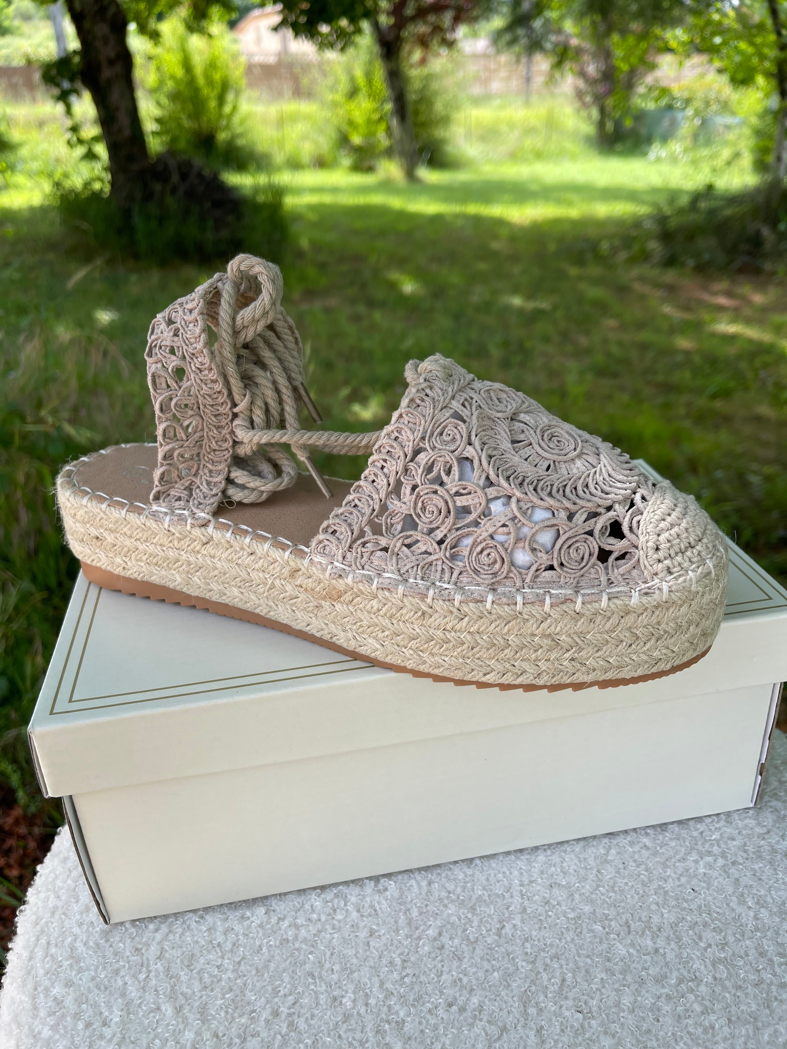 Paloma, c’est la sandale bohème par excellence. Avec son tissage en spirales crochetées à la main et ses cordons à nouer autour de la cheville, elle dégage un charme artisanal et solaire. Sa semelle en corde tressée lui apporte un confort parfait pour les longues journées d’été à flâner.