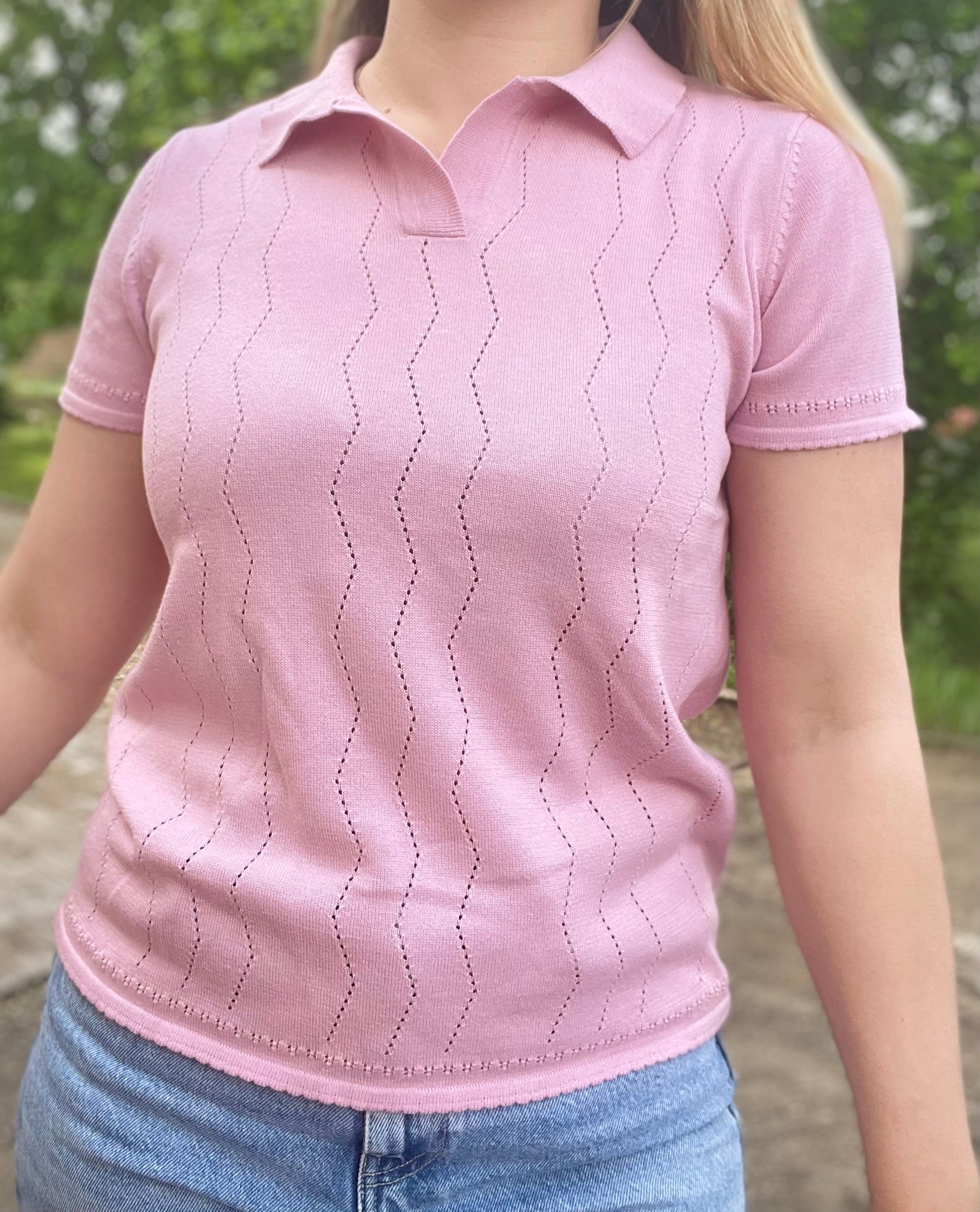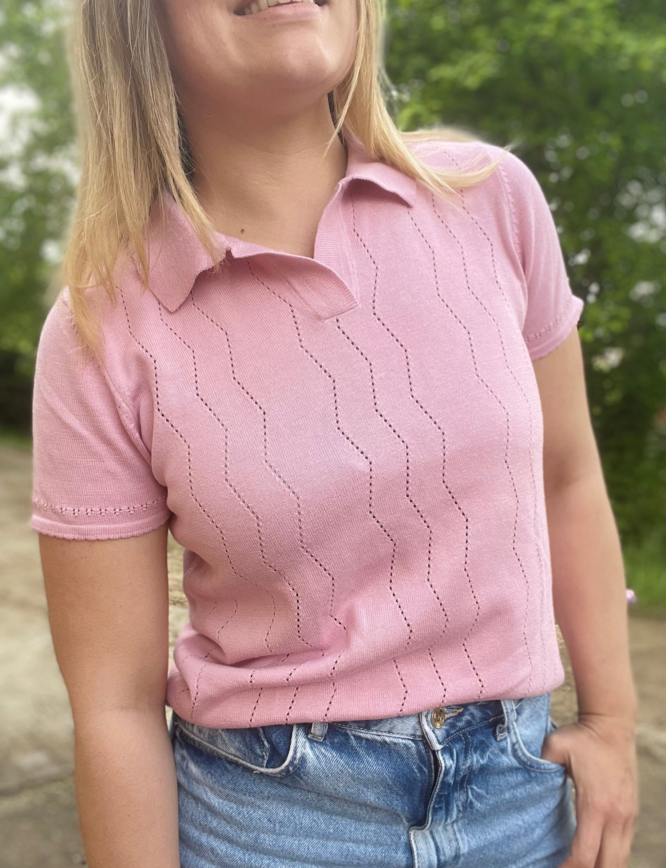 Un bijou vintage tout en douceur, à l’allure rétro romantique. Ce top en maille ajourée rose clair séduit par son col vareuse façon chemise, pour une silhouette féminine et un brin espiègle.