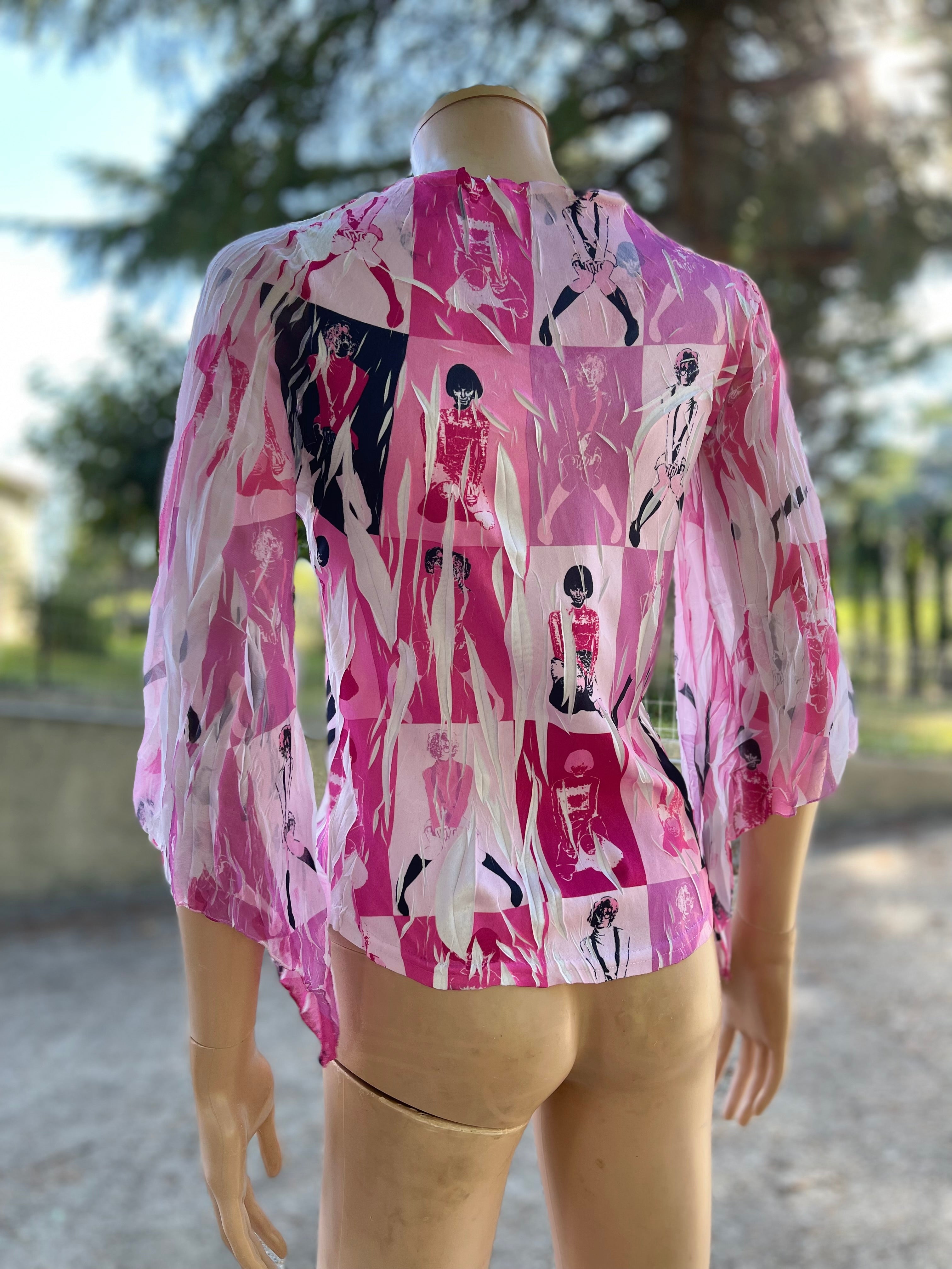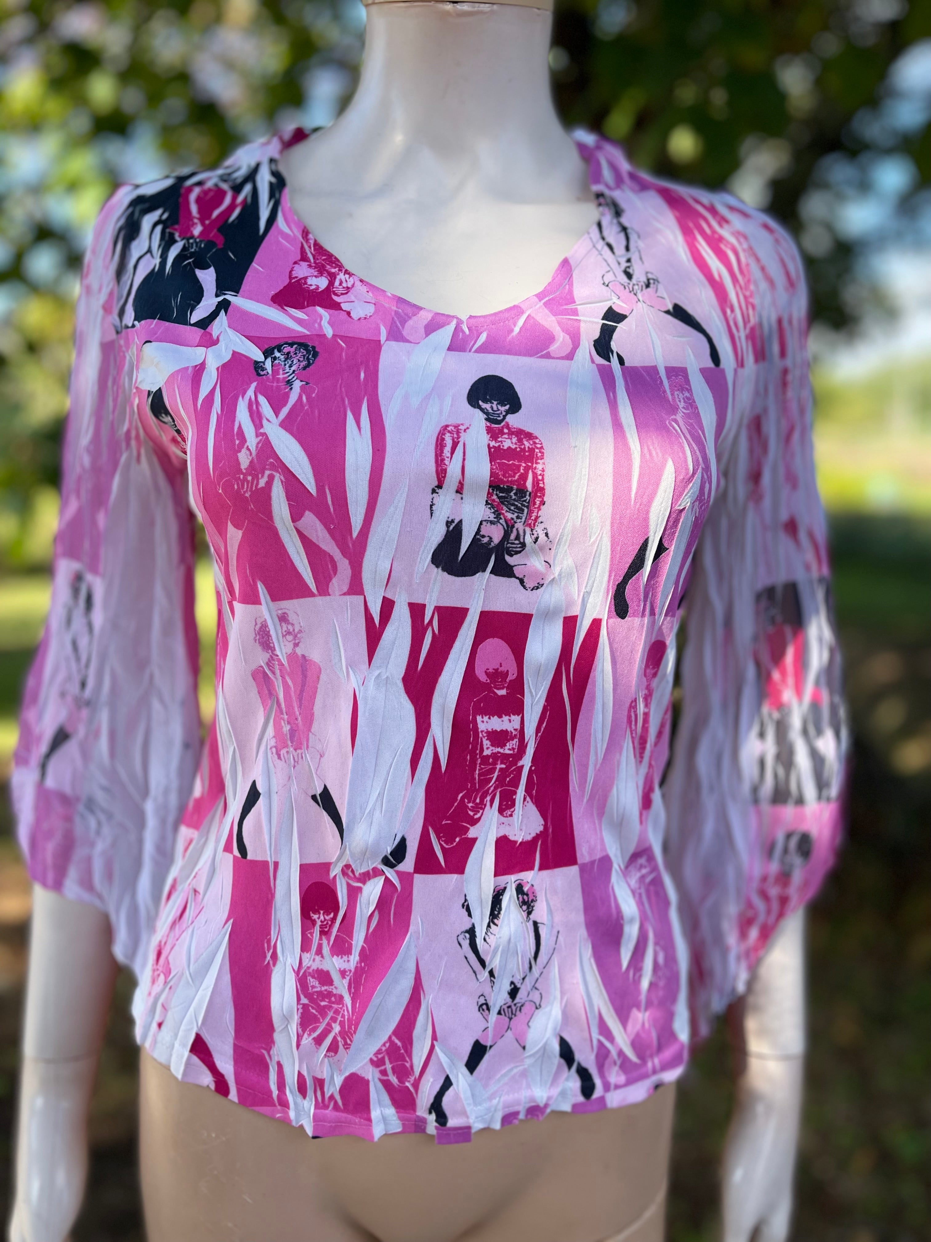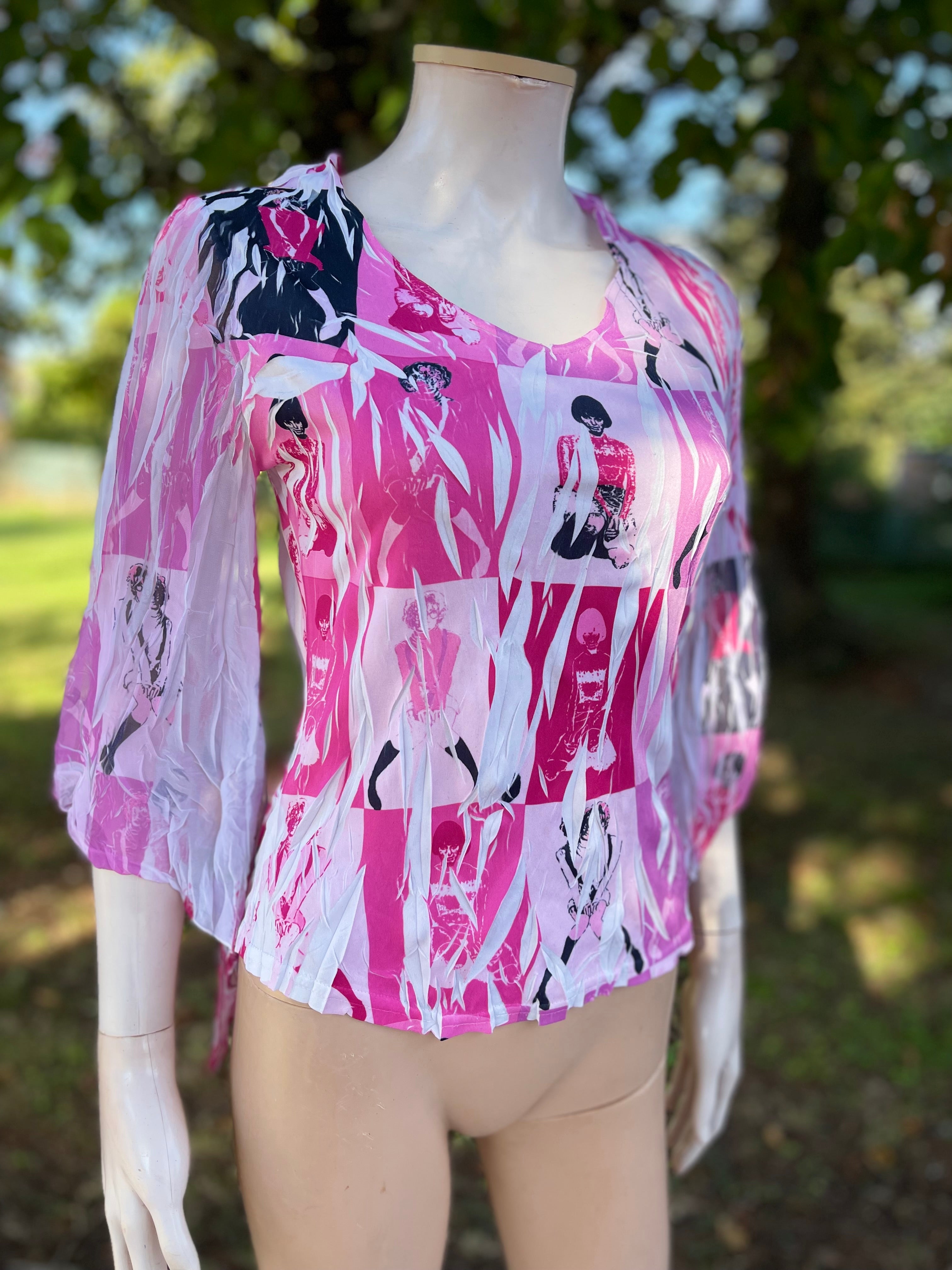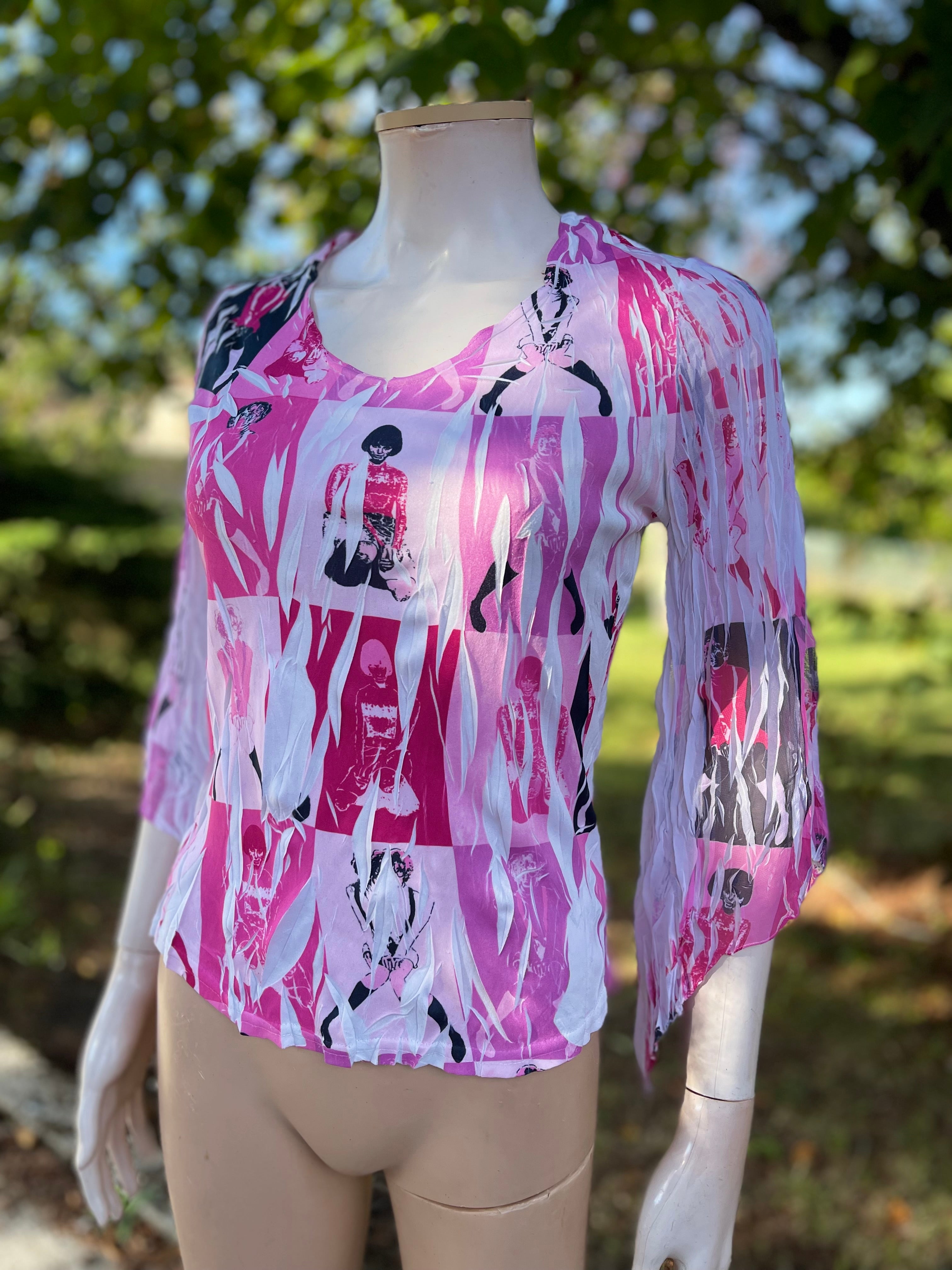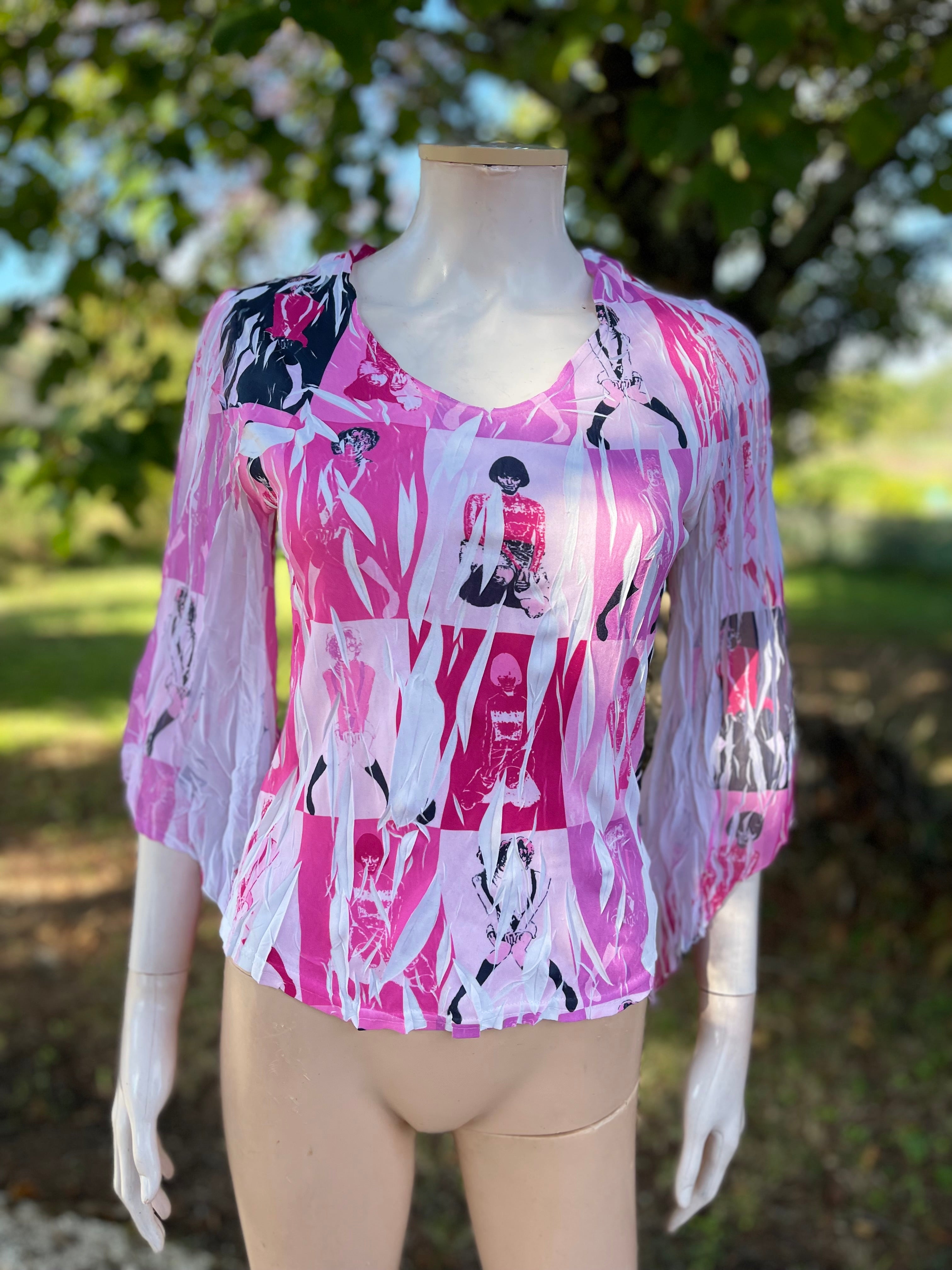 Un vrai coup de cœur Y2K ! Ce top coloré et audacieux reprend tout l’esprit des années 2000 avec son imprimé pop aux tons rose fuchsia, noir et blanc, mettant en avant des silhouettes graphiques façon collage rétro. Léger, fluide et légèrement stretch, il se porte près du corps et épouse les formes tout en gardant un style original et affirmé.